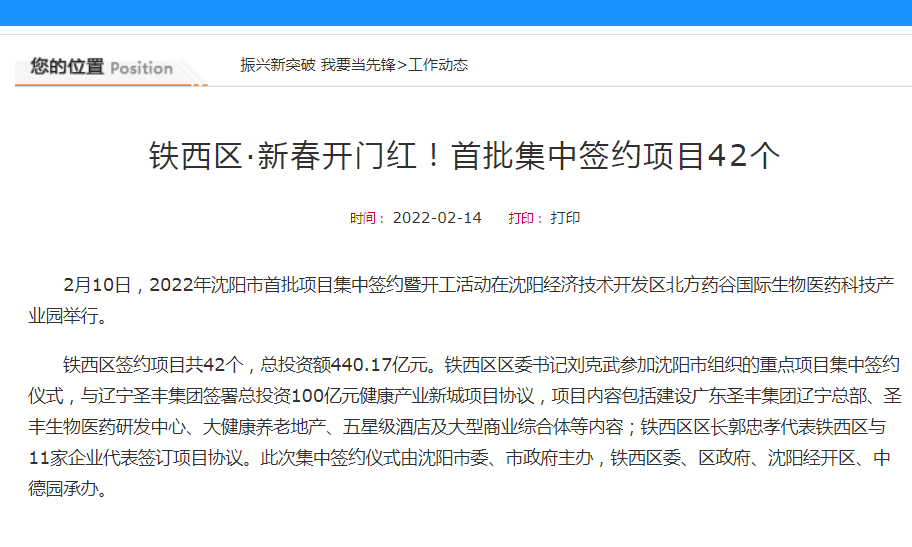 根据铁西区政府网显示,铁西区在2月份与辽宁圣丰集团签署总投资100亿元健康产业新城项目协议,项目内容包括建设广东圣丰集团辽宁总部、圣丰生物医药研发中心、大健康养老地产、五星级酒店及大型商业综合体等内容。